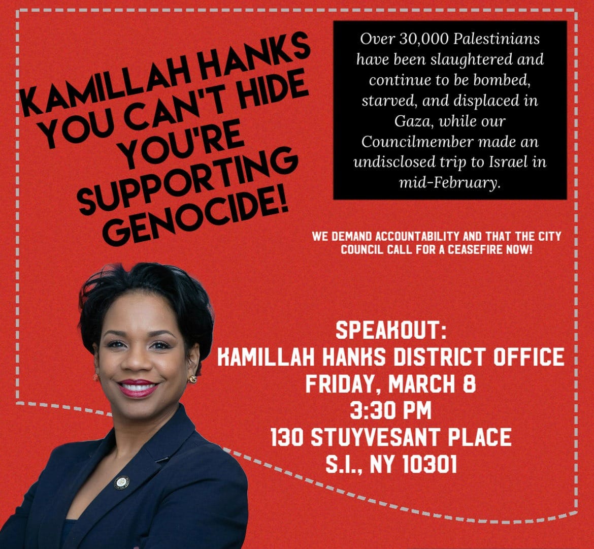 Staten Island 4 Palestine, a coalition of local grassroots groups including Staten Island DSA, Peace Action Staten Island, Staten Island Against Racism and Police Brutality, About Face, Al Awda, Mamas for a Free Palestine, and the Party for Socialism and Liberation organized a speak out on March 8, at Councilperson Kamillah Hanks district office, to condemn her visit as not in line with constituents' desires. "We know that their loyalty is being bought, and they are not beholden to us, they are beholden to AIPAC [American Israel Public Affairs Committee]," commented Omnia Hegazy on Councilperson Hanks and Assemblymember Charles D. Fall representing Assembly District 61.